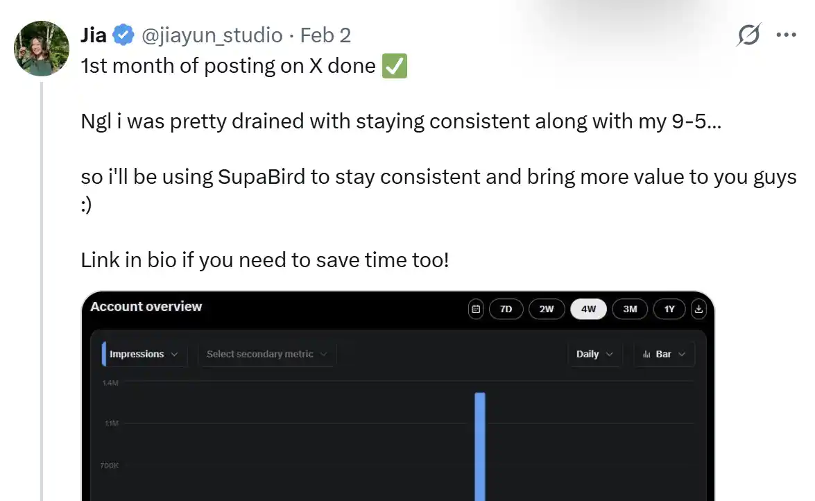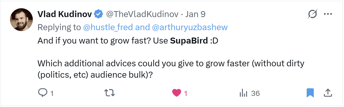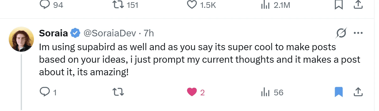 "I would usually manually write down best parts from YT videos to reuse them for my X posts, now SupaBird just does this for me!"