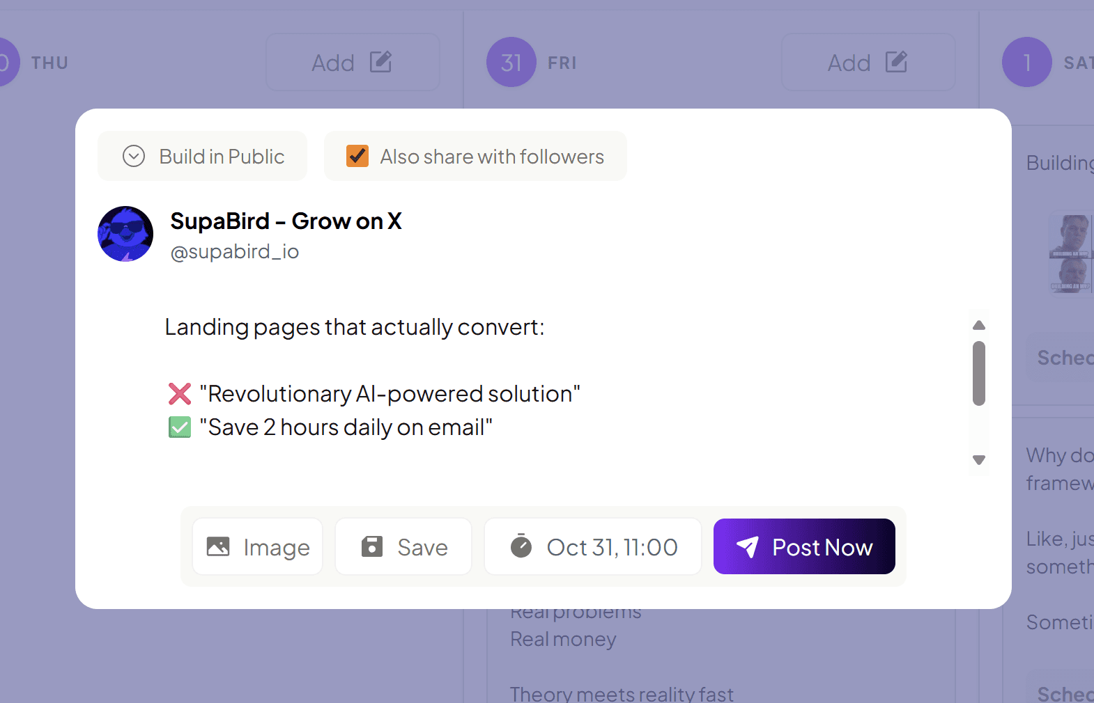 Posting in communities is extremely important to boost growth. You can easily do this with SupaBird