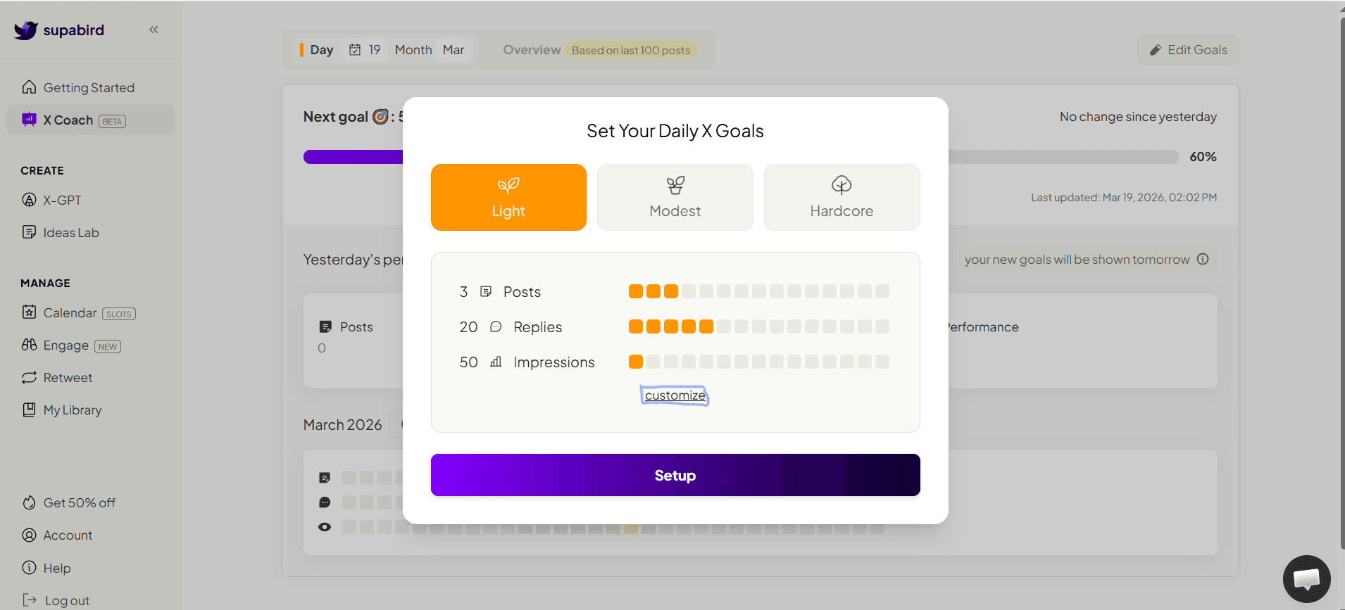 SupaBird X Coach helps you improve your X performance through data, goals, and actionable insights.
