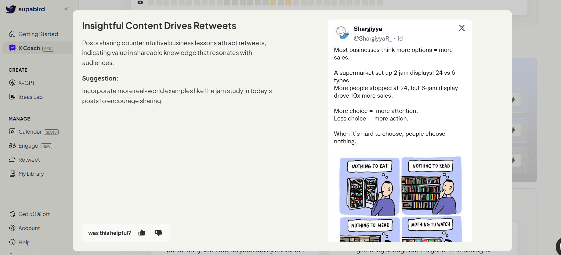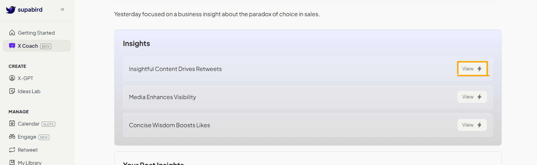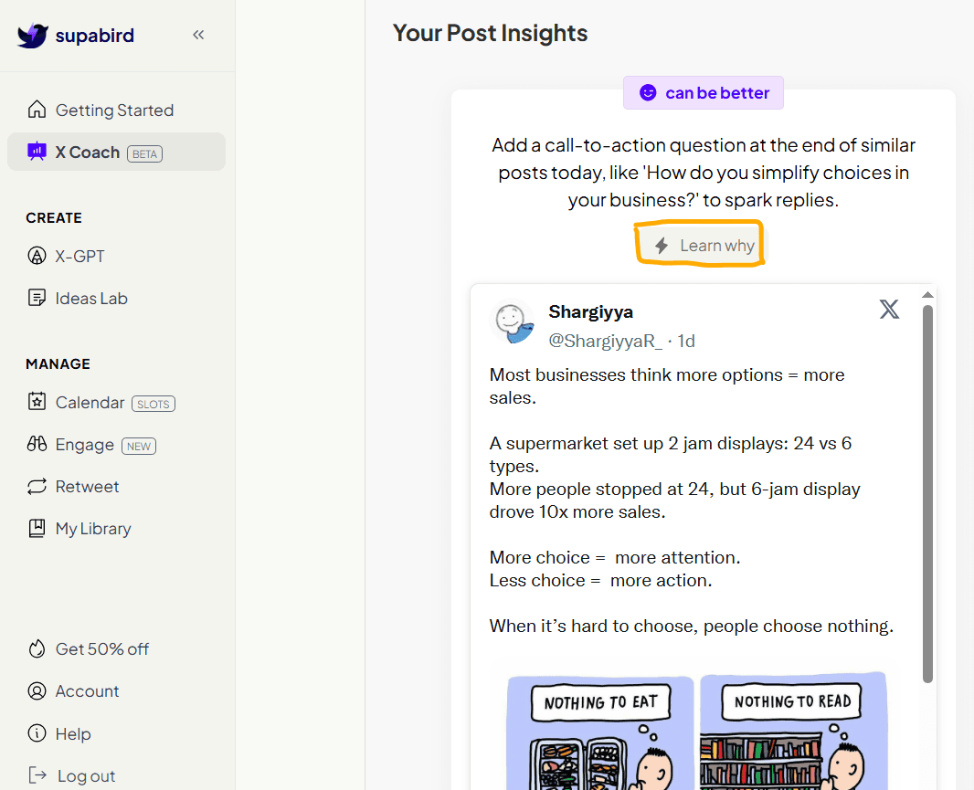 SupaBird X Coach helps you analyze your content performance, understand what works, and improve your posts with actionable insights