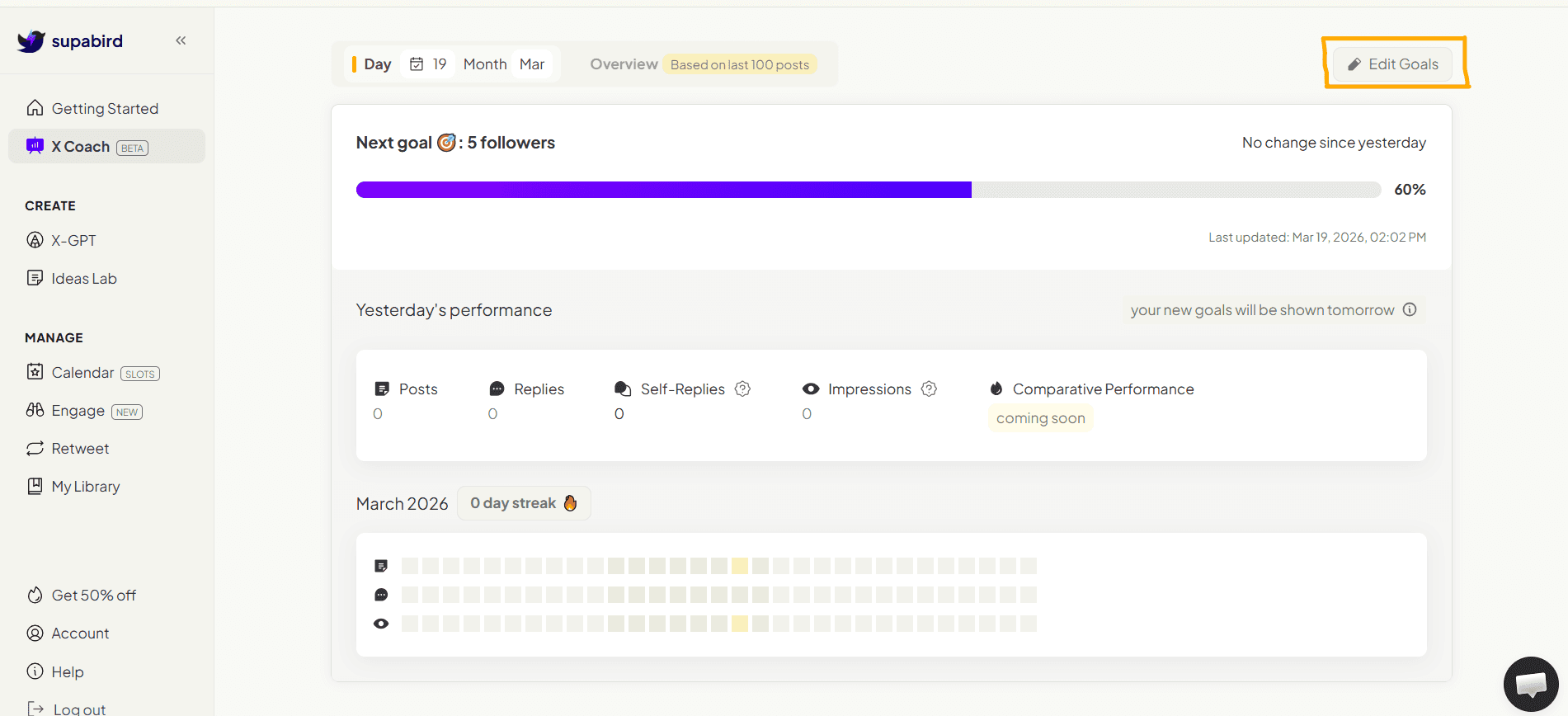 SupaBird X Coach analyzes your activity and gives you goals, insights, and recommendations to grow your X account.
